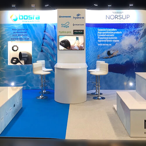 Display plinths were created for both brands to display their products. Our team measured all featured products and custom made the plinths to ensure that the products fitted the display perfectly on the day. Swimming pool lights lit the bottom of the back wall to highlight the stand and the lights themselves as a featured product.