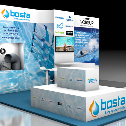 Bosta’s stand would be at Spatex 2019 and was 6x5m and open on three sides, So we aimed to display their chosen products, create a free flowing stand that could be walked around easily, whilst also including visual segregation to clearly show the two brands sharing the space.