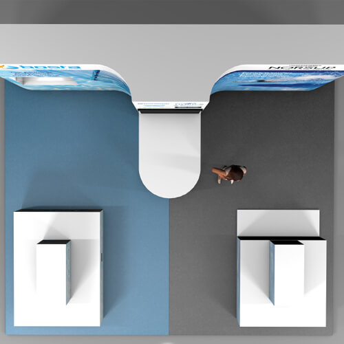 Our concept included the use of curved flowing lines for the back wall, which worked well with the water graphics that had been freshly designed for the show. A 40” central presentation screen was integrated in the centre of the stand above a main counter, providing space for a seated meeting. The counter itself served as hidden discreet storage. As a bespoke element, we were able to create the perfectly curved counter with sliding doors, which gained access to a generous ‘hidden’ storage area located within the main back wall of the stand.