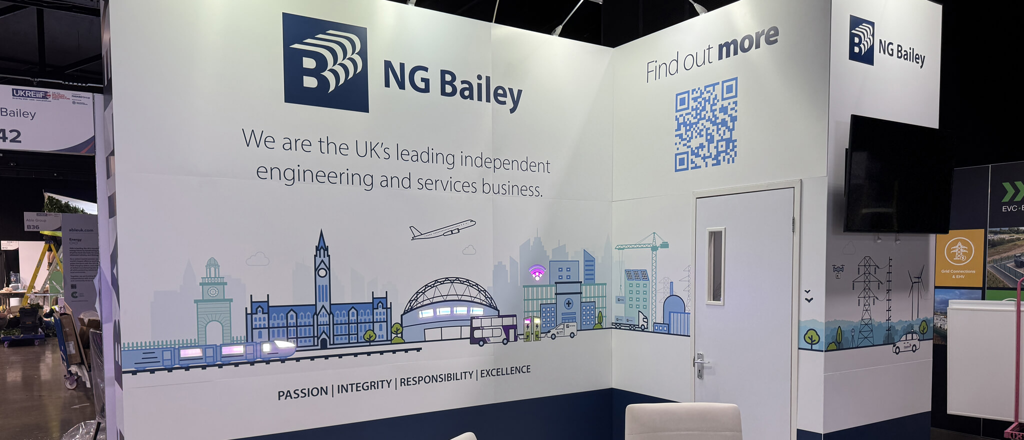 Following several successful stand builds with Freedom Group, we were introduced to NG Bailey, another company within the group, to assist with the concept and build of their stand for UKReiif 2025.