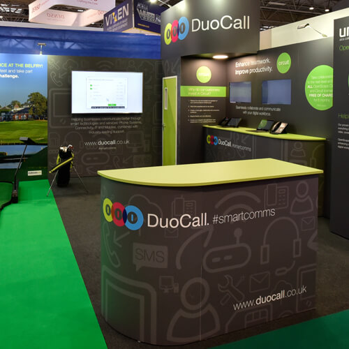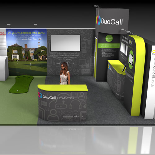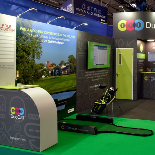DuoCall wanted a solution for their stand at Automechanika Birmingham, NEC. They wanted to include a 7ft Putt Challenge game onto the stand, plus a live demo station to showcase their video conferencing product, with storage area and presentation screen.
