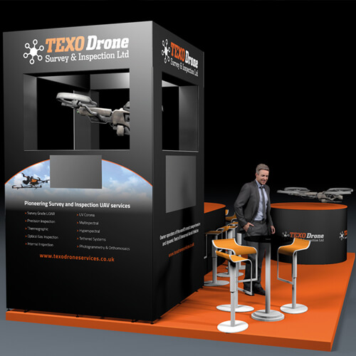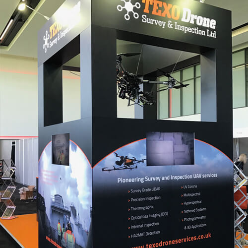 The Total Decom-Decommissioning Conference was the first exhibition Texo Drone Survey & Inspection Ltd had attended. As headline sponsor, Texo Drone needed a stand with impact. The limitation was stand size, the biggest stand that Total Decom could offer was a 6 x 4 island. With space at a premium and needing to showcase two very large and impressive drones on the stand, we decided to go high. Creating a 3.5m tower which could house the Drone with internal lighting and 3 large tv’s playing show reels. This enabled us to display all the key messages required and get the company logo up high, which could be seen all around the exhibition. The tower doubled as storage and kitchen area for the stand. A fridge, coffee machine and a complementary tin of biscuits made sure the Texo Drone staff were well catered for. With an additional large circular counter to the front of the stand displaying the other drone. The Drone was lit from below and all power cables were run under the raised floor.