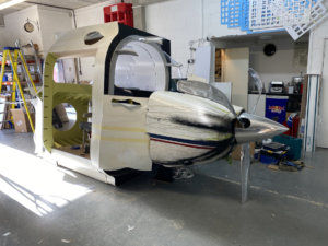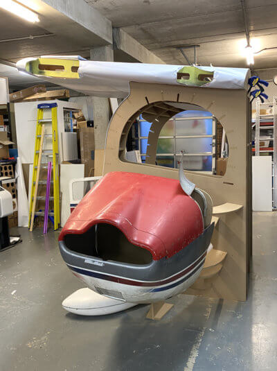 We had to construct the plane in several sections as access to the club was limited and very tight. The fact that they wanted the plane to look like it had crashed played out well for us as we could hide the joining sections in the damage. We applied 3mm foamex to the framework and then with a heat gun, we bent the foamex to form the desired shapes. The wings were clad in a PVC banner material, a sourced wing tip with flashing light was bolted on to the end. We added several fixing points to the wing so we could securely hang it from the ceiling. The propeller was heated and bent, then the lower section cut to support the weight of the nose.