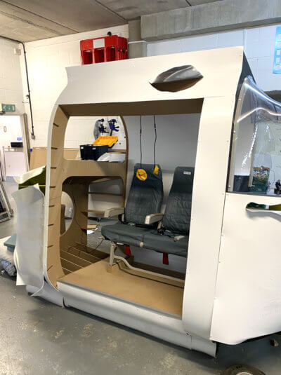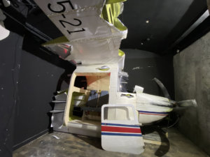 W3 added varnish and paint to get the distressed look needed. Once it had been assembled, the team at Cirque Le Soir added the foliage, smoke machines and lights bringing everything together. We then added the final props and a dismembered pilot!