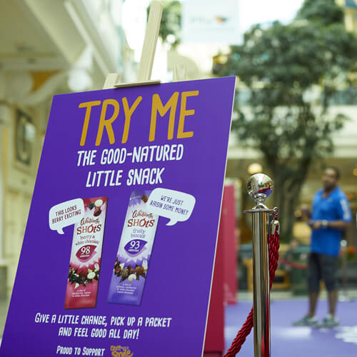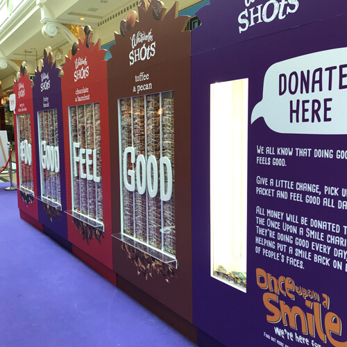 We knew that fulfilling the various requirements of the brief would need a custom approach. MDF was used to create sturdy structures that could hold a lot of product, as well as supplying a means to discreetly refill the hoppers and provide hidden storage for the samples. The products needed to be visible inside the dispenser, so bespoke cut acrylic fronts were used and all of the MDF units were fully wrapped with branded graphics to create a seamless and visually exciting wall of product sampling, fundraising and prize drawing.